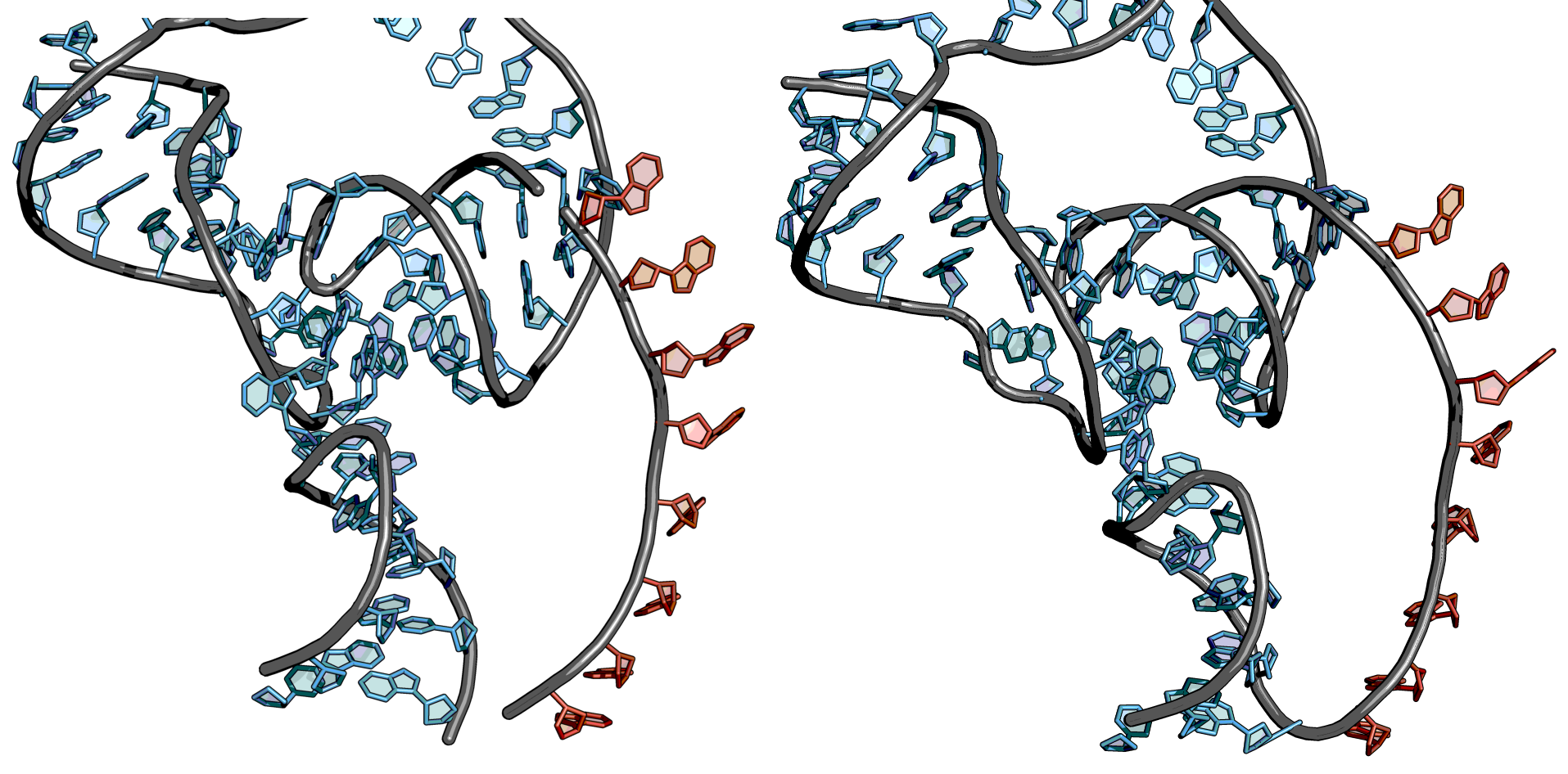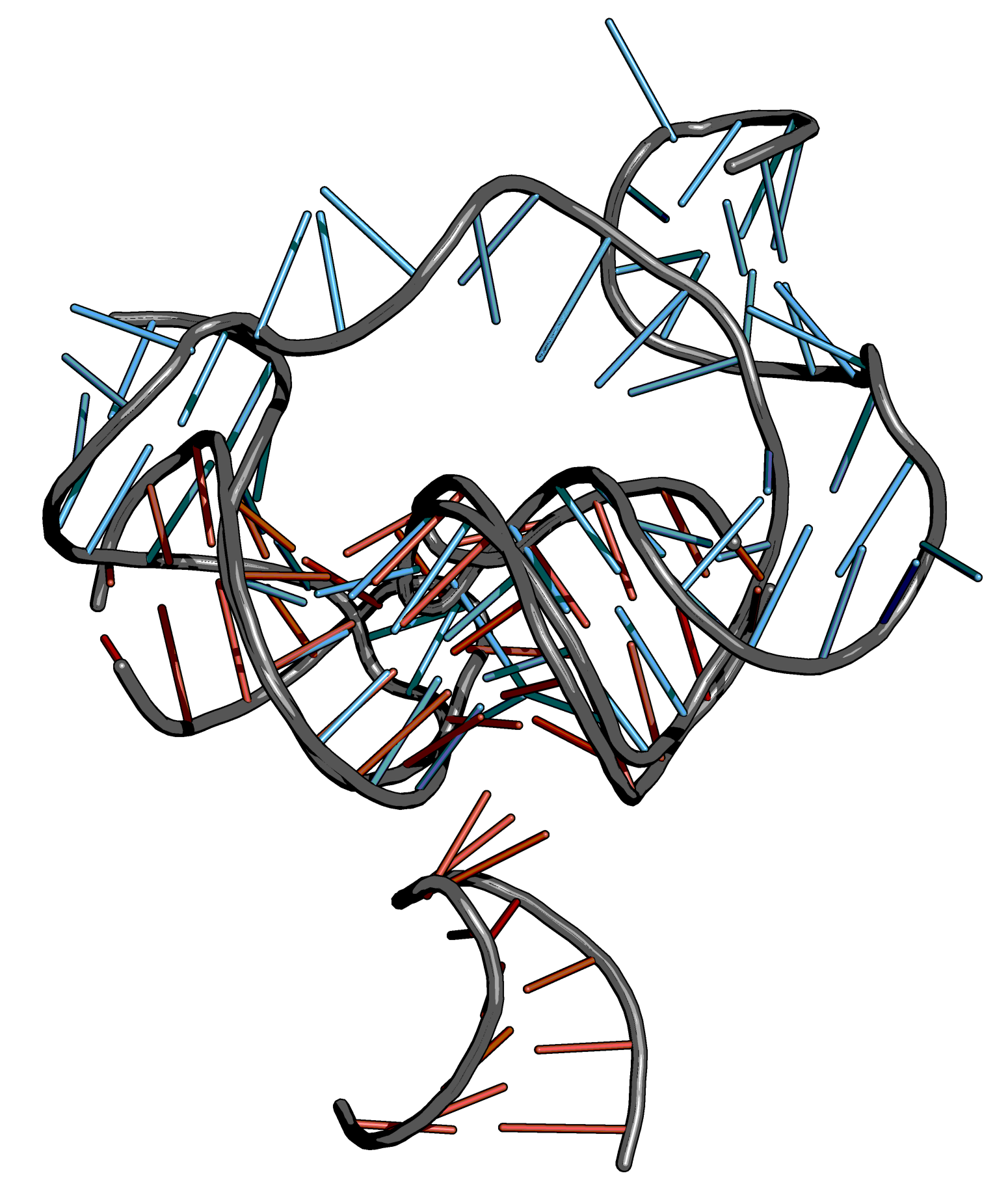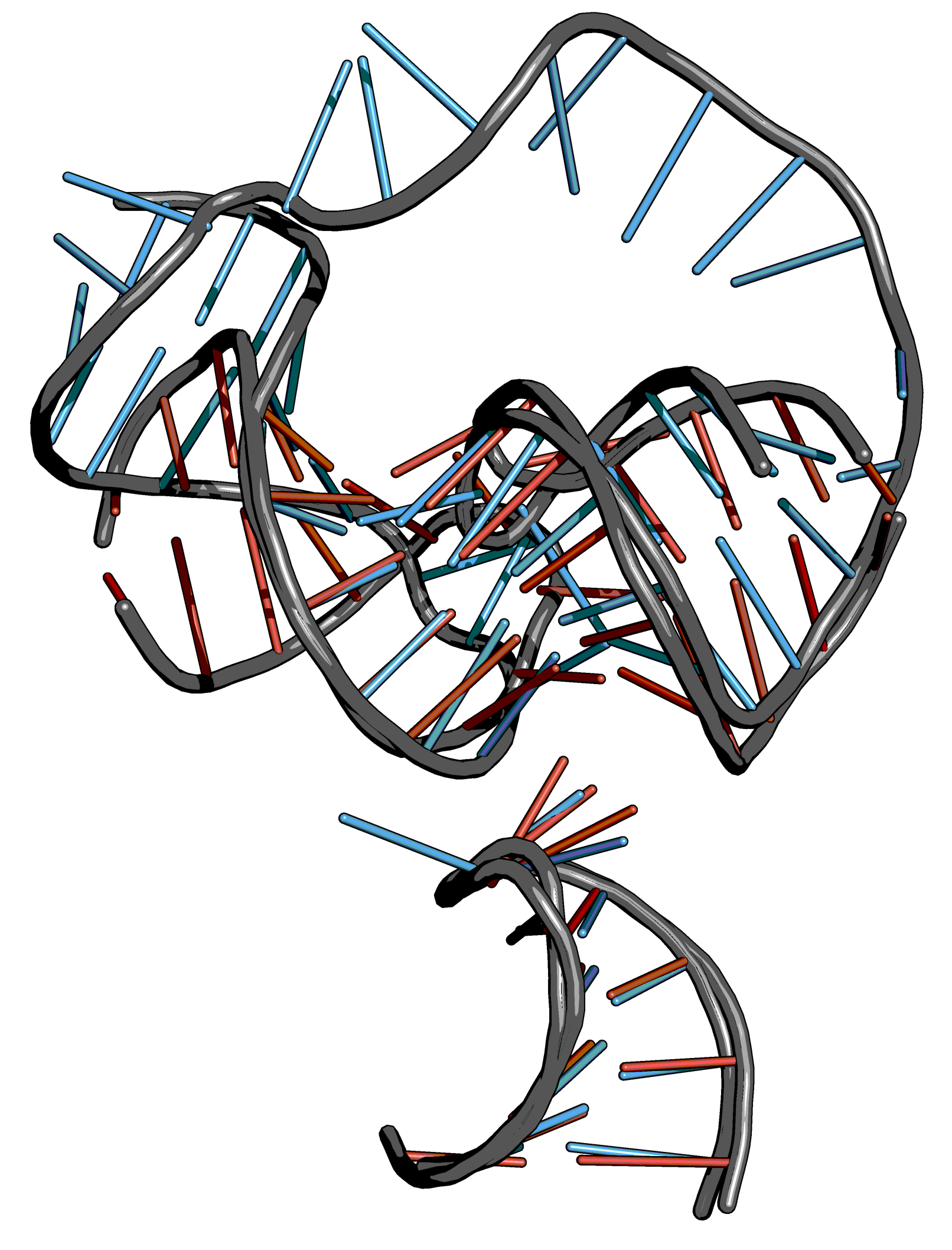 The helix-like structure can be resolved by twisting the bases at the backbone. To do so, set the PyMOL window to editing mode and press ⇧ shift on a bond. With presses command key, the bases can then be rotated at the bonds.